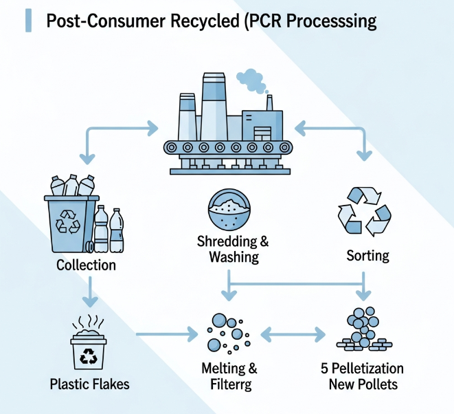 소비자 사용 후 재활용(PCR): 이 자료는 대중이 사용하고 폐기하는 제품에서 나온 것입니다. 이는 매립 및 오염 문제를 직접적으로 다루는 물질이며, 이를 회수하는 것은 더 큰 물류적, 기술적 과제입니다.